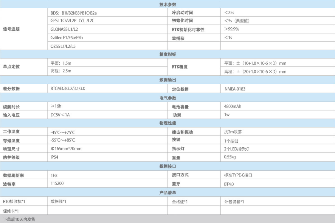 R10一款輕巧,簡單,實用的高精性能全星座GNSS RTK接收機,支持五星十